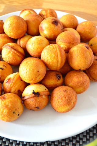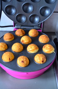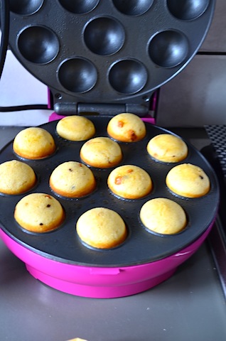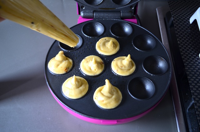Ik heb een bakspray van dr. Oetker gebruikt om de ijzers in te vetten. Voor het vullen van de plaat kan je het beste een spuitzak gebruiken. Zo kan je het beslag het beste doseren. Ik heb de halve rondjes ongeveer voor 3/4 gevuld. Als je er teveel beslag in doet, krijg je een soort van UFO cake bal. Je kan 12 cakeballetjes tegelijk maken. Het is het slimste om even een klein testje te doen, voor de garing van je cake balletjes. Ik heb ze 3 minuten per kant gebakken. Halverwege draai je de balletjes om met het vorkje en bak je ze aan de andere kant goudbruin. Dit lijkt wel een beetje op poffertjes bakken.