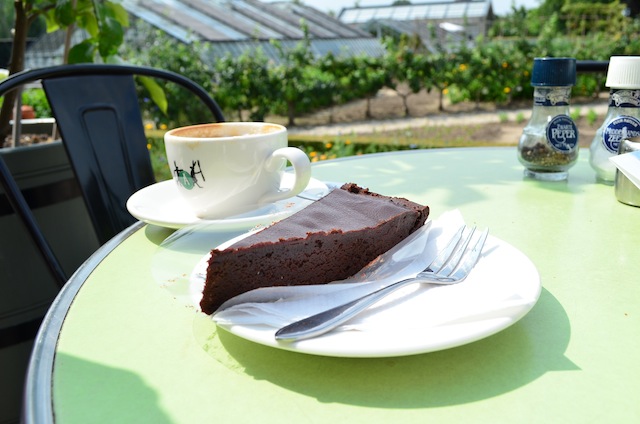 Wij hadden een zonnige dag uitgekozen en namen plaats op een lekker plekje op het terras. Met uitzicht over de enorme moestuin. Ik bestelde een lekkere zuurdesem boterham met zalm en de Mr. nam een lekkere punt donkere chocolade taart. Allebei even lekker.