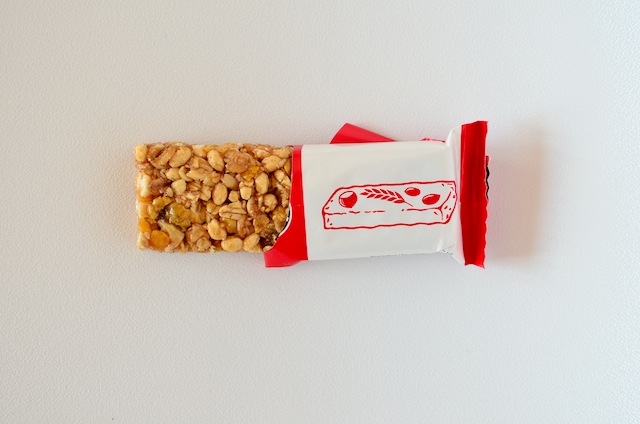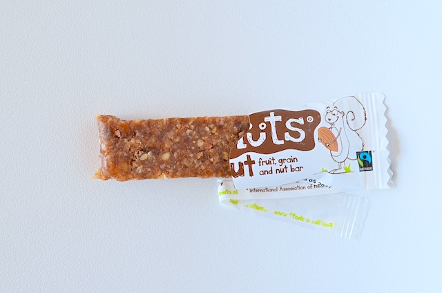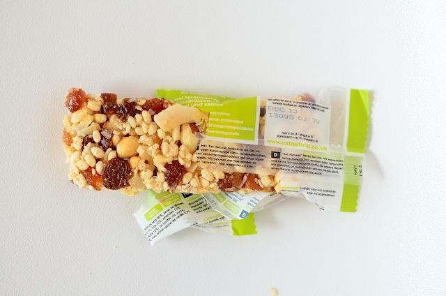 Een hazelnoot en mueslibar van Euroshopper, een budget vriendelijke keuze maar geen verstandige keuze. De reep bestaat uit 66% muesli, honing, havermout, gepofte rijst, cornflakes, glucosestroop, suiker, maltodextrine, emulgator, aroma’s en een aantal onbekende ingredienten en E nrs. Niet zo healthy dus, maar dat staat ook nergens vermeld, dus misleidend is het niet. De reep bevat 99 kcal per reep, waarvan 15 gr koolhydraten en 3,5 gr vet. Met de calorieen valt het dus wel mee, maar de suiker zal zorgen voor een korte opleving.