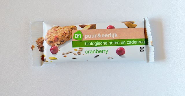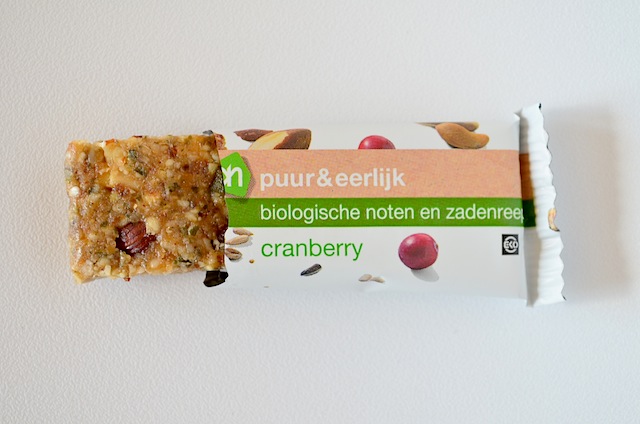 Denken jullie bij Puur & Eerlijk ook automatisch dat het goed is? Ik heb dat wel, de marketingmensen hebben hun werk dus goed gaan. Ik kocht deze biologische reep met cranberry. Hij is goed gevuld, er zitten zonnebloem pitten in en pompoenzaad en sesamzaad. Ook bevat deze reep verschillende soorten noten, kokos, sinaasappelolie en cranberry’s en rozijnen. Naast deze ingredienten bevat de reep glucosestroop en dat is niet gezond. Glucose is hetzelfde als druivensuiker (gezonder) maar glucosestroop kan je vergelijken met suiker. Een reep bevat 165 kcal, waarvan 11,1 gr koolhydraten, 12 gr vet.