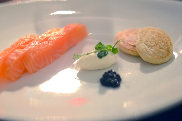 want daar komen we natuurlijk voor, was heerlijk. We starten met een amuse van makreel met frisse appel en een schuim van bleekselderij, lekker fris. Daarna volgde een huisgerookte zalm met mierikswortelcrème en boekweitpannenkoekjes, ook wel blini’s genoemd, wederom erg smakelijk. Mijn favoriete gerechtje van de avond was een salade van rauwe pompoenlinten met peer en Pierre Robert kaas, de kaas kun je een beetje vergelijken met een zachte brie, ik vond hem heerlijk. Het hoofdgerecht was kalfstaartstuk met ravioli van kalfswang begeleid door een madeirasaus. Vooral die ravioli was goed, lekker mals en vol van smaak. Het nagerecht bestond uit een voor mij te zoete witte chocolade cheesecake met yoghurt met dulce de leche. We sloten af met een kopje koffie met vers gebakken madeleines.
