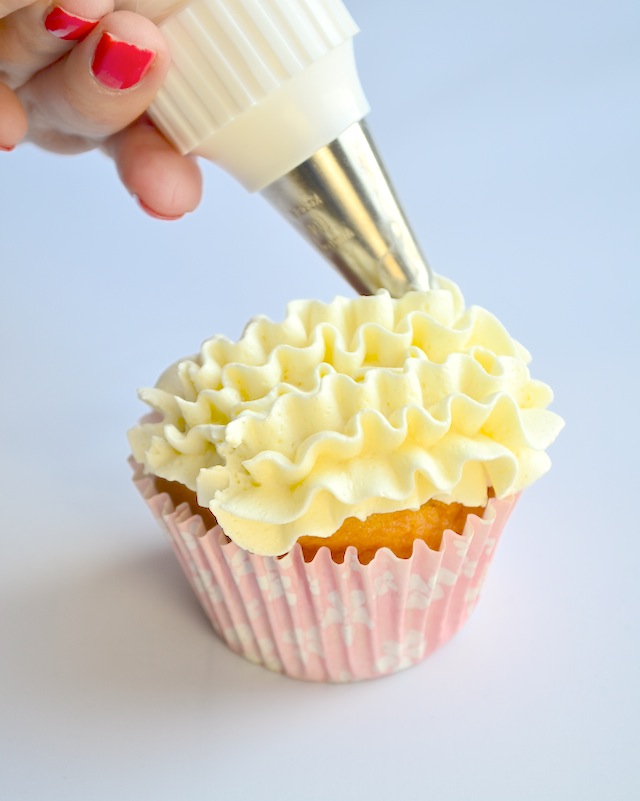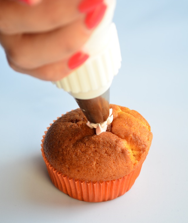 Hou de spuitzak recht op en plaats de spuitmond op de buitenste rand van de cupcake. Zet hem in het midden.