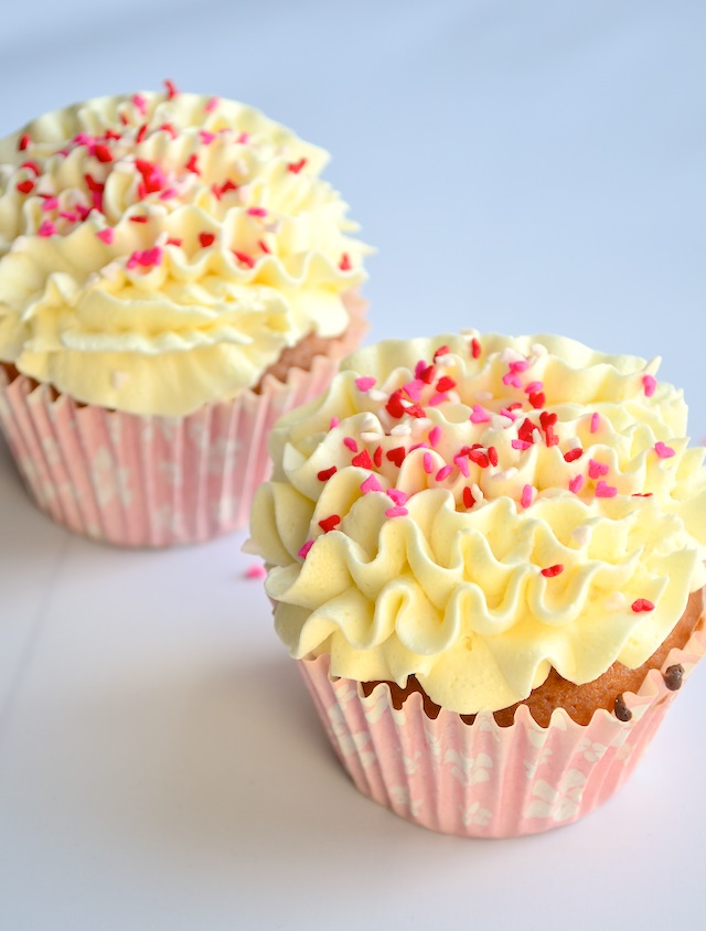 Versier de valentijns cupcakes eventueel met hartjes sprinkles, bloemetjes van marsepein, chocolade schaafsels. So sweet!