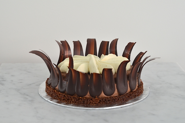 Chocolade taart met een bodem van notencrumble, een donkere chocolademousse met gezouten karamel, een biscuit getempereert met Tia Maria en witte chocolade vanille mousse, goddelijk!