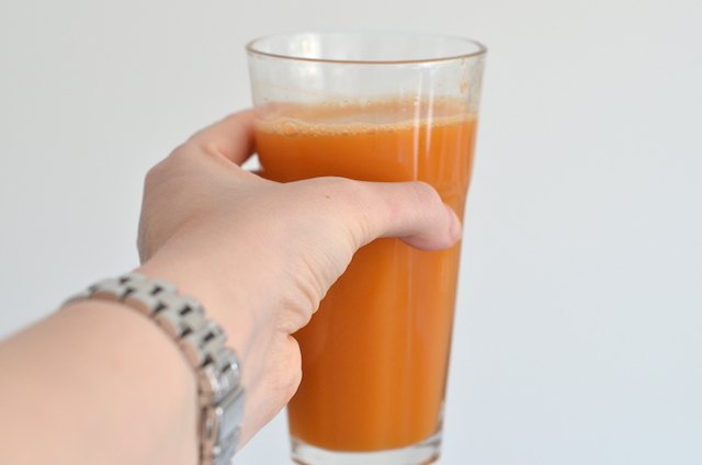 Neem 6 wortelen (bospeen), 1 appel en 1 limoen en pers dit uit in de sapcentrifuge.