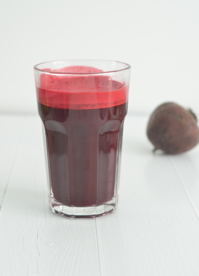 Neem 2 rauwe bieten, 1 appel, 1 citroen en een stukje gember van 1 cm en pers dit uit in de sapcentrifuge.