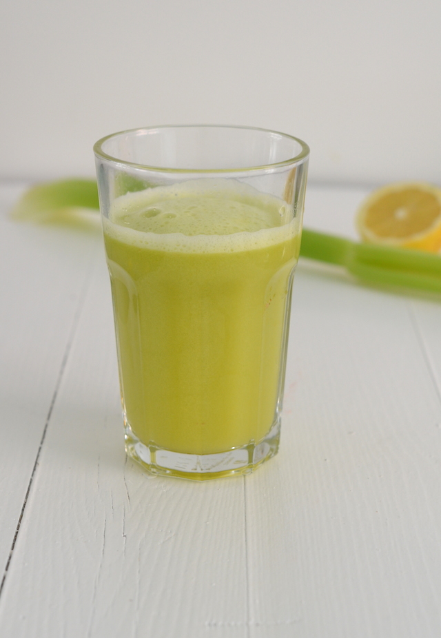 Neem een stukje komkommer van 10 cm, 2 stengels bleekselderij, 1 appel en 1 citroen en pers dit uit in de sapcentrifuge.