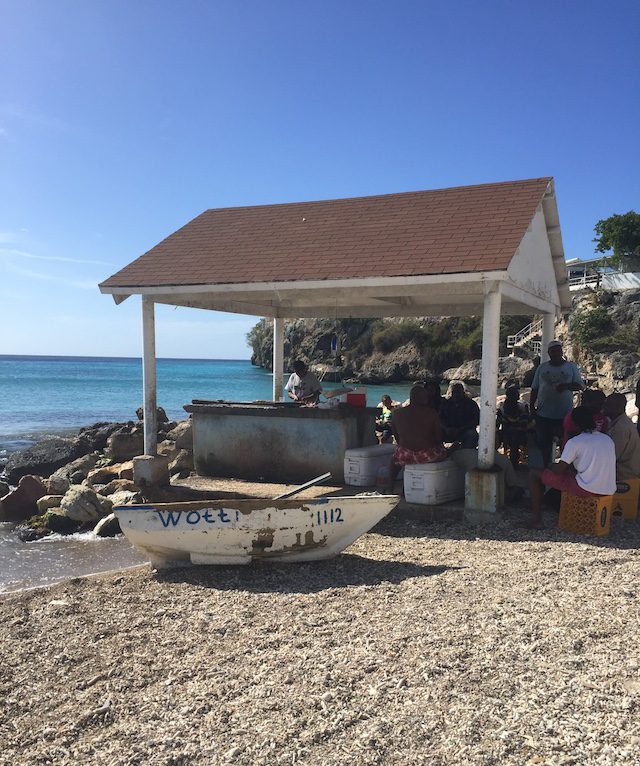 Rijd je helemaal door naar het Westen dan kom je uiteindeljk uit bij de All West Appartments. Maak hier even een tussenstop. Je vindt hier een pier waar alle vissersboten aanmeren. De verse vangst wordt onder het genot van een paar glaasjes rum ter plekke schoongemaakt. Ik vond dit erg leuk om te zien en te horen. Want die mannen hadden enorm veel plezier, waarschijnlijk door de rum.