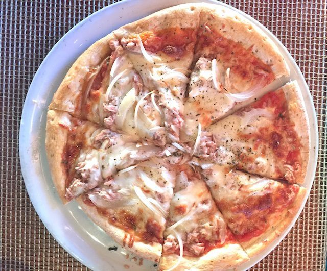 Een pizza-tje eten bij Zanzibar. Ik vond hem niet top. Volgens mij miste er wat zout in het deeg en in de tomatensaus.