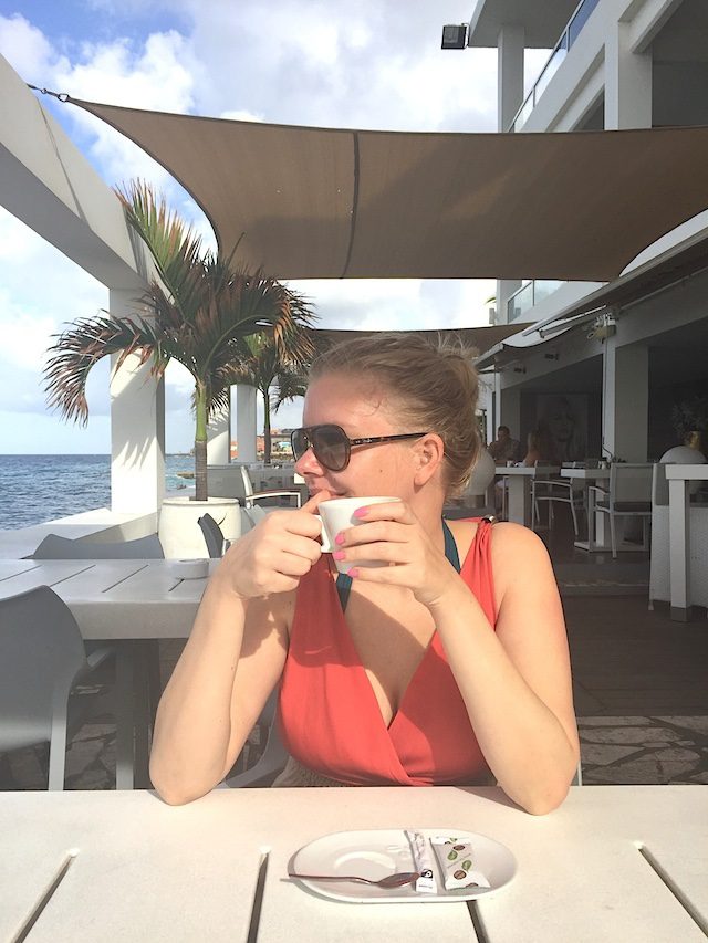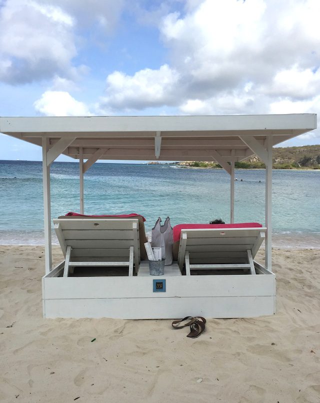En daarna koffie drinken in een Cabana met uitzicht op de zee. Het grote voordeel van maart is dat het dan niet extreem druk is op Curaçao. Toch waren de bedjes al heel snel vol. Handig om dit even te reserveren dus.