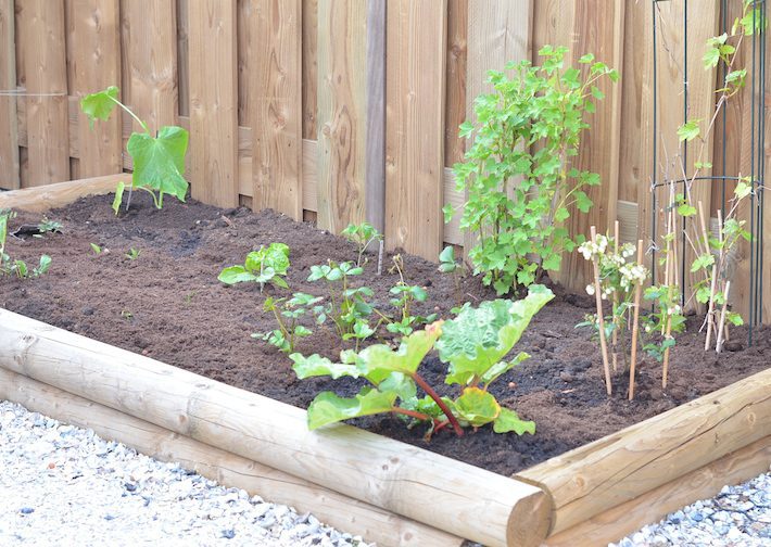 Omdat ik dus kennelijk te ongeduldig ben, ik plant alles direct in de grond, en dus niet goed voor mijn baby’s kan zorgen, besloot ik wat oudere plantjes te kopen bij het tuincentrum. Plantjes die al enigszins volgroeid zijn. Zodat het niet meer mis kan gaan. Hoop ik! Ik kocht een blauwe bessenstruik voor naast mijn rode bessenstruik van vorig jaar, halleluja ik kan toch wel iets goed doen. Daarnaast zette ik wat aardbeienplanten en een rabarberplant in de grond. De druif is een projectje van Mau. Ik ben benieuwd hoe dat gaat. Aan de groentekant pootte ik (ok het was Mau, want slecht weer) wat sjalotjes, een radijs en een extra tomaten- en paprikaplantje. Ook kocht ik nog een komkommerplant en die zette ik tegen de schutting. Ik mis alleen nog een courgetteplant en dan is mijn tuintje klaar.