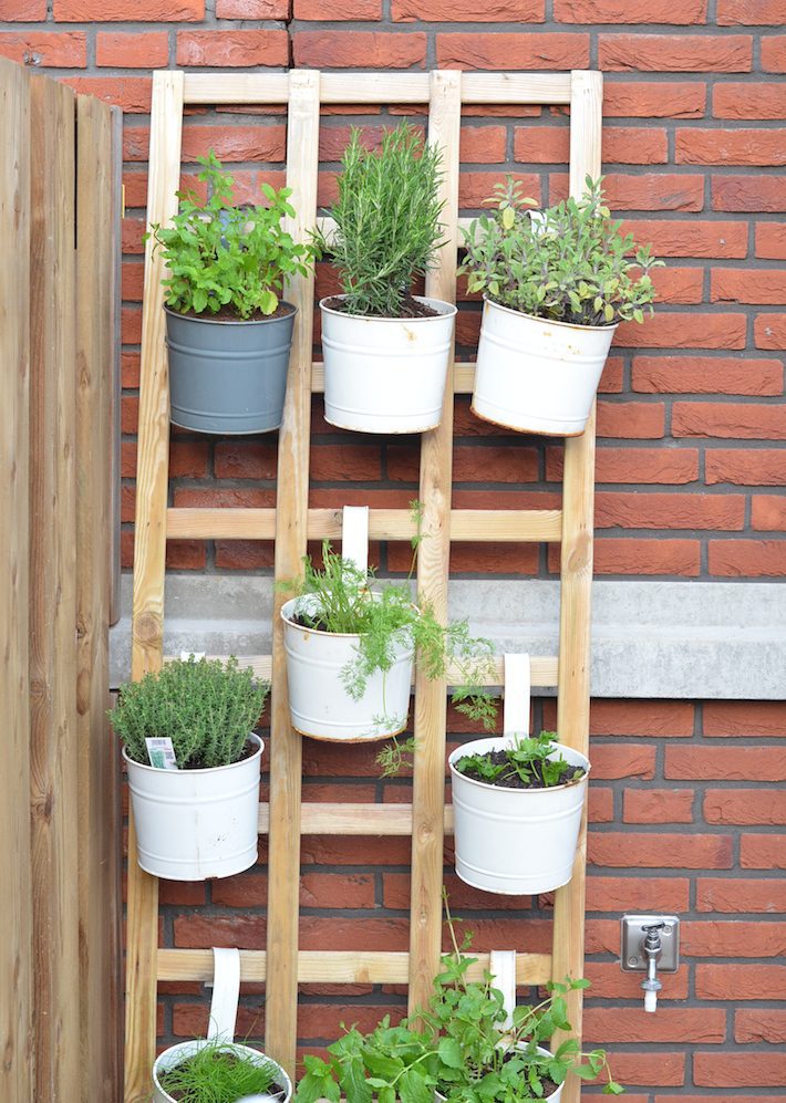 Kijk hier ben ik wel goed in! Al jaren heb ik een verticale kruidentuin. Dit was destijds een hele goede optie op mijn balkon, want weinig ruimte, en toch veel resultaat. Maar die verticale kruidentuin is gebleven. Het wandrek kan je bij ieder tuincentrum en iedere bouwmarkt wel kopen. De hangpotten zijn van de HEMA, die heb ik nu ook al een aantal jaartjes. In de potten heb ik basilicum, munt, dille, bieslook, platte peterselie, rozemarijn, tijm en salie gepoot. (ok heel eerlijk, ik heb het dus niet zelf gezaaid). En er is niets fijner dan om tijdens het koken met een schaartje naar buiten te lopen en wat smaakmakers te plukken. Dus ook al heb je weinig ruimte, een kruidentuin kan altijd!
