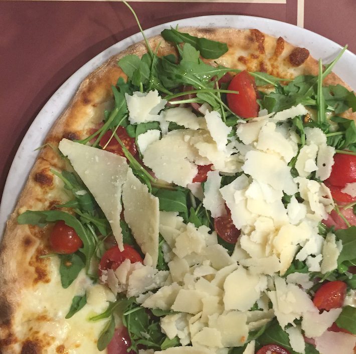 Ik at overigens niet alleen maar lekker. Deze pizza was geen favoriet. Ik houd van kaas, maar dit was mij zelfs teveel. Want naast de Parmezaan boven op lag er ook nog een kilo mozzarella onder. De ham was wel lekker trouwens.