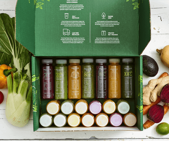 Ik heb mijn detox besteld bij Frecious slowjuice. We hebben momenteel een leuke memberactie lopen met Frecious en het leek mij een goed idee om zelf ook te ervaren hoe het is om een detox te doen. Bij Frecious kun je een abonnement nemen op hun sappen, je kunt af en toe een box bestellen of zoals ik, een detox box bestellen. Je kunt uit verschillende detoxes kiezen, een driedaagse, een vijfdaagse of zevendaagse. Ik heb gekozen voor een driedaagse detox bestaande uit 18 juices, 3 soepen en 7 shots. Daarnaast heb ik de vijfdaagse afterdetox besteld met 10 juices, 5 health bars en 3 elixers. De afterdetox zorgt ervoor dat je na je detox je gewone voedingspatroon weer rustig op kan bouwen.