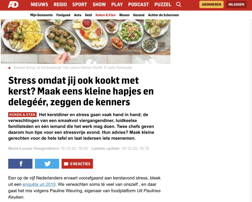 De afgelopen jaren zijn wij volop in de media verschenen. Van TV optredens bij Koffietijd en Hart van Nederland tot interviews in publicaties in kranten zoals Telegraaf, het AD, HDC en DVHN. Ook de tijdschriften weten ons te vinden en we hebben tientallen publicaties in bladen als Libelle, Vrouw, Flair, Margriet en bijv. Jumbo magazine. Ook online wordt ons regelmatig gevraagd naar onze expertise over eten door websites als nu.nl en ad.nl.
