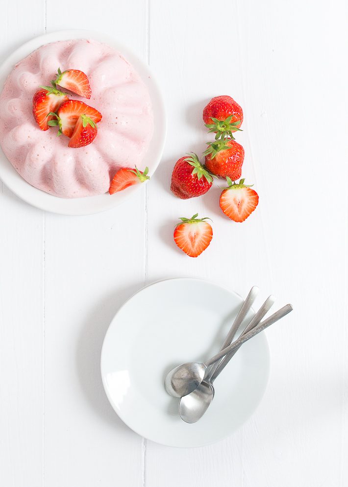 Ik houd van frisse smaken. Deze aardbeienbavarois met yoghurt is er zo eentje. Het perfecte toetje na een zwaar diner. Licht, fris en vooral heel lekker. Extra lekker omdat de aardbeien nu volop in het seizoen zijn. Ze zijn zoeter dan ooit en daarom heb je niet heel veel suiker nodig. In plaats van suiker heb ik agavesiroop gebruikt. Je zou ook honing kunnen toevoegen. Ik ben zelf niet zo van het extreme zoete. Houd je wel van zoet, voeg dan gerust een scheutje extra toe. Proef het vooral voordat het de vorm ingaat, koken is toch vooral proeven. Yes, daarom vind ik het zo leuk.