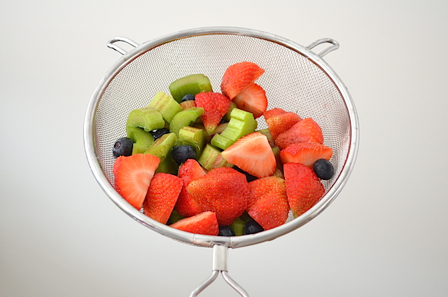 Was de blauwe bessen en de aardbeien en verwijder de kroontjes.