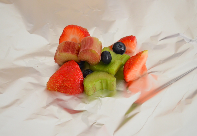 Rabarber kan je heel goed klaarmaken op de barbecue. Doordat het in een afgesloten pakketje zit, is het binnen 10 minuten klaar. Ik heb in dit geval aardbeien en blauwe bessen toegevoegd, maar je kunt ook frambozen, bramen, kersen of ander lekkers stoven. Met een bolletje ijs er bij, heb je een lekker en niet al te zwaar toetje. Ik heb wederom gekozen voor yoghurtijs, dat is lekker fris en licht, maar ik denk dat vanille- of kaneelijs er ook erg lekker bij is.