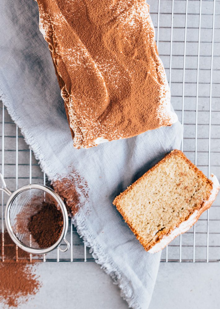 Bestrooi de koffiecake met cacao. Snijd de cake in plakjes.