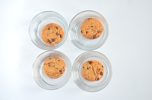 Neem 4 kleine bakjes of glaasjes en leg op de bodem van elk glaasje een koekje.
