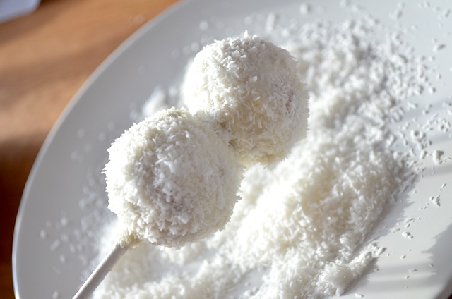 Leg een bordje klaar met kokos snippers.
