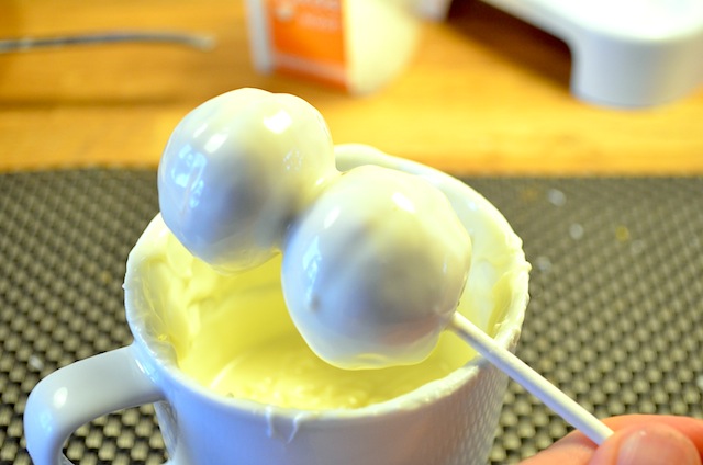 Vervolgens dip je de gehele cakepop in de witte chocolade en laat je dit uitlekken.