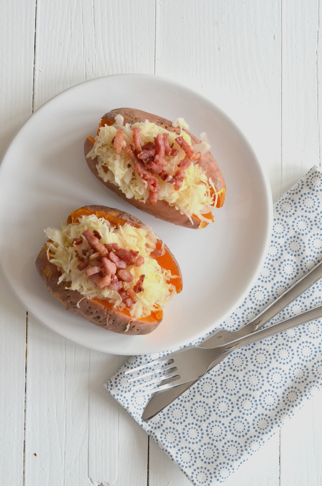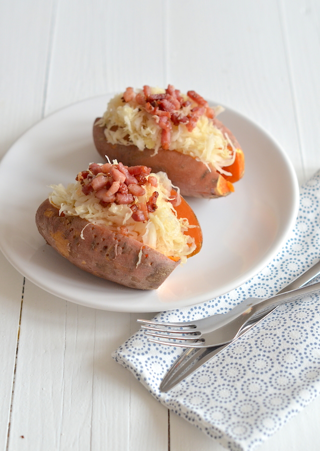 Sinds ik Masterchef (Australia) volg ben ik in de ban van de term deconstructed. Wat niets meer is dan een uit elkaar getrokken recept. Vaak doen ze dit met taartjes en toetjes en maken ze er een heerlijk recept van met allemaal losse onderdelen. Eigenlijk is deze gepofte zoete aardappel een deconstructed zuurkoolstamp. Het zijn aardappelen, zuurkool en spekjes, maar die worden los bereid. Zou je alles door elkaar stampen dan heb je een zoete zuurkoolstamppot.