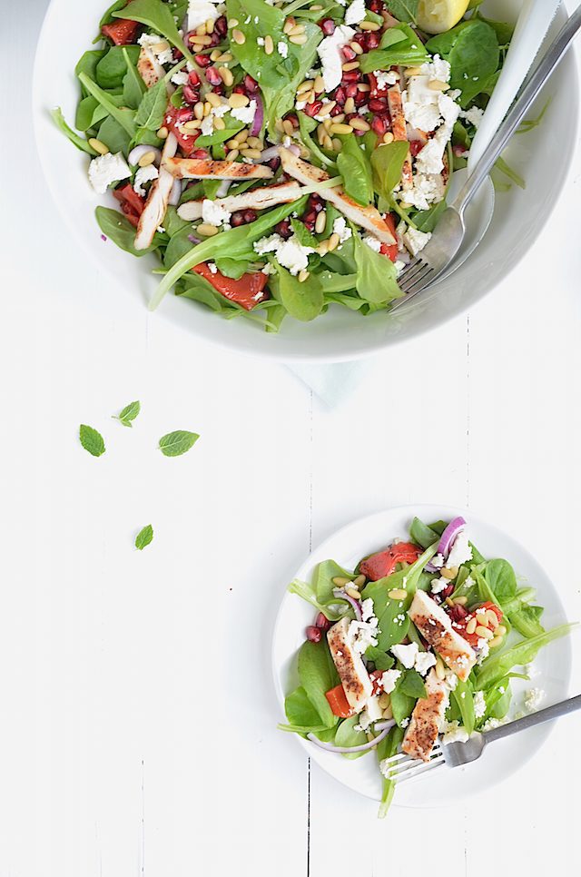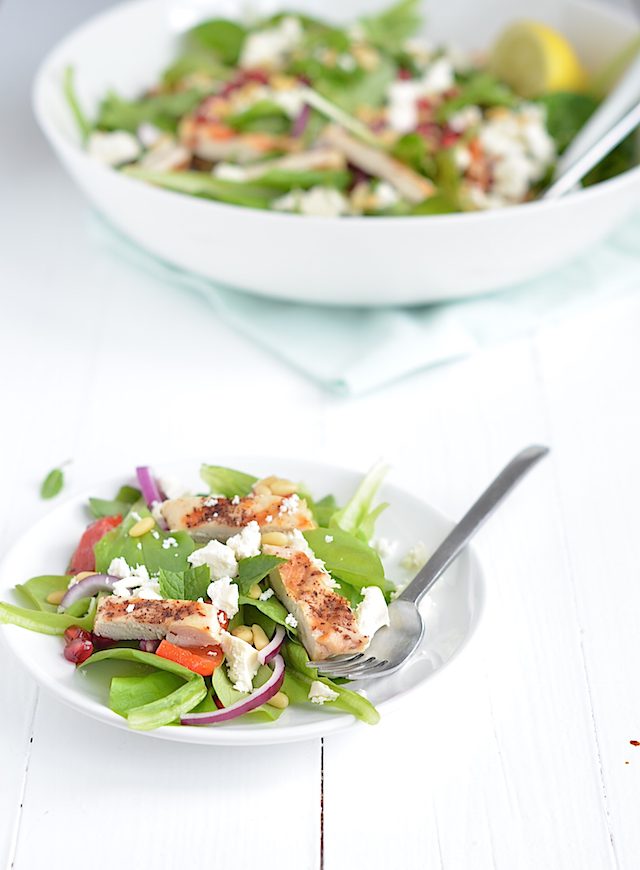 De kip kruidde ik met sumak, nog zo’n fijne uit de Arabische cuisine. Het heeft ook een friszure smaak, superlekker. Leuk detail is dat de veldsla die ik voor deze salade gebruikte, uit eigen tuin komt. Jeej. Maurits had een heel zakje zaadjes leeggestrooid over een bak met aarde. Met als gevolg, heel veel veldsla, zo leuk! Ik word er oprecht heel blij van als ik sla uit eigen tuin kan plukken. De tomaatjes waren helaas nog niet rijp, anders had ik die ook nog toegevoegd. In plaats daarvan gebruikte ik nu geroosterde paprika, ook fijn!