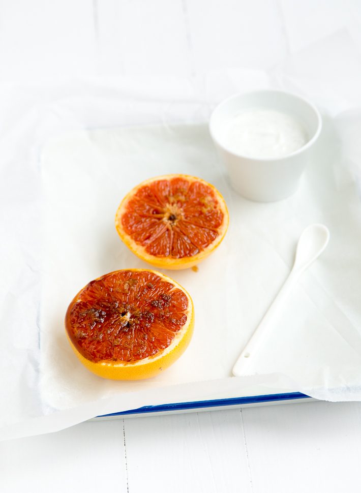 Grapefruit brulee is Hot & Happening op insta en pinterest. What’s the buzz about? Ik ben daar natuurlijk zwaar gevoelig voor en moest en zou dat uitproberen. Het idee is al net zo simpel als dat het lijkt. Het is gewoon gecarameliseerde grapefruit. En niets meer dan dat. Dat effect krijg je door een beetje suiker over de grapefruit te strooien en deze laat je dan carameliseren. Dit kan op verschillende manieren; 1. je kunt hem omgekeerd in een koekenpan leggen, 2. je zet er een stevige brander op, of 3. je plaatst de grapefruit even onder de grill. Dat laatste deed ik. Wel zo makkelijk.