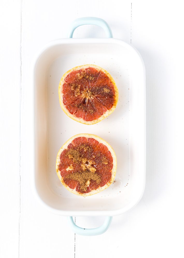 Leg de grapefruits in een ovenschaal en plaats deze bovenin de oven. Zet ze een minuut of 8 onder de grill. De grapefruit brulee is klaar als de bovenkant goudbruin geworden is. Houd het tussentijds goed in de gaten, want het kan snel verbranden. Je kunt de suiker dus ook met een brander carameliseren.