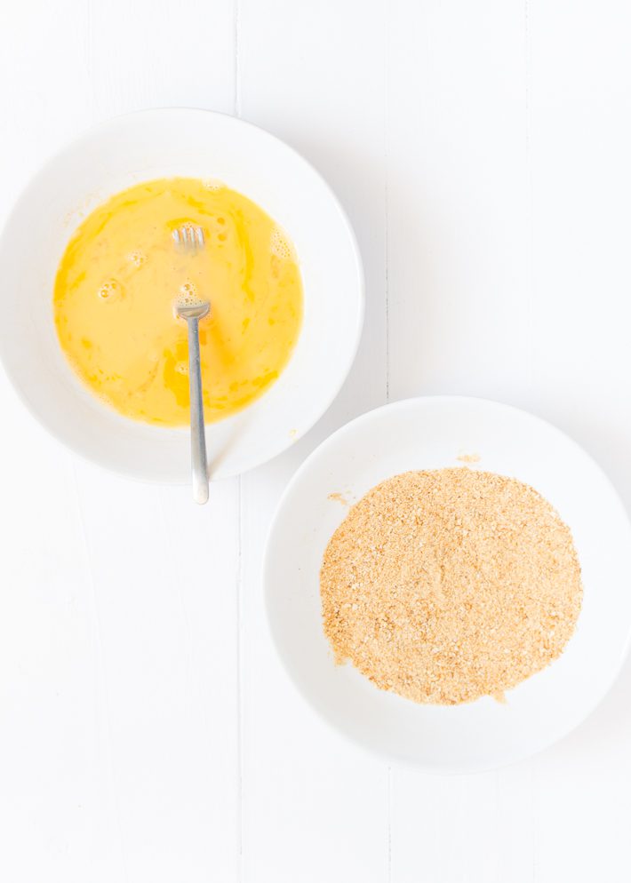 Klop de eitjes los in een bord. En verdeel flink wat paneermeel over een ander bord.