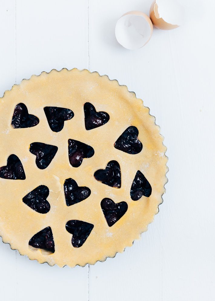 Speciaal voor valentijn haalde ik mijn hartjes uitsteker weer eens uit de kast. De hartjes die je het uit het deeg steekt zou je eventueel ook op de rand kunnen plakken. Maar ik bakte er koekjes van. En de andere helft (ok iets meer dan de helft) verdween rechtstreeks in mijn mond. Ik ben dol op rauw taart- en koekjesdeeg. Niet echt goed voor je, maar zo lekker. Misschien nog wel lekkerder dan de afgebakken versie. Ben je niet zo dol op kersen? dan kan je deze fruittaart ook met frambozen maken, of met bramen of met blauwe bessen. Kan allemaal, dus gebruik vooral wat je lekker vindt.