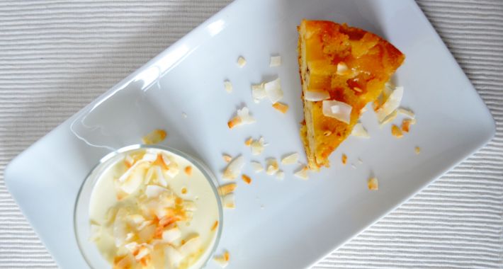 Serveer de kokosmousse samen met een puntje van de mango taart. Rooster wat kokosvlokken in een droge koekenpan en garneer hier het bord mee.
