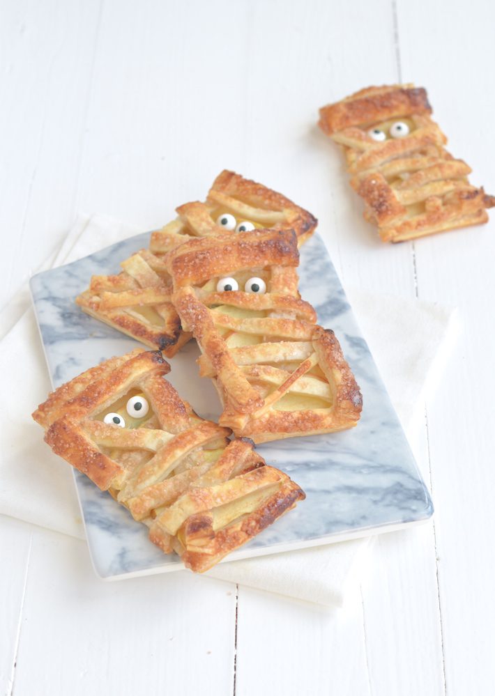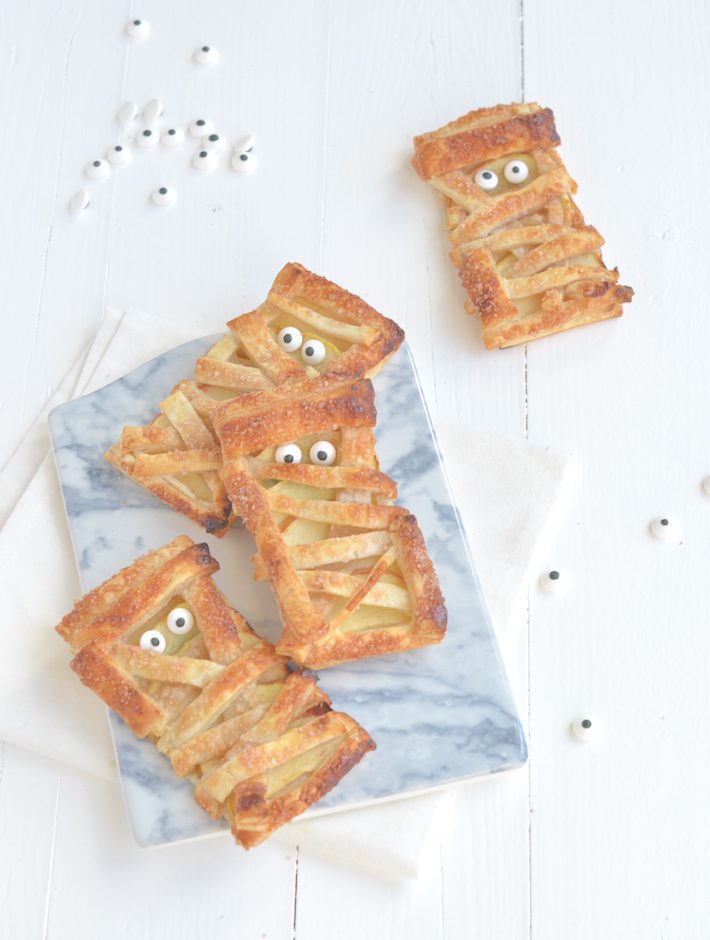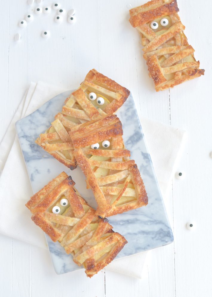 Leeft Halloween eigenlijk een beetje in Nederland? Wordt er op de scholen iets mee gedaan? Daar ben ik wel nieuwsgierig naar. Zo ja, dan kan ik je deze bladerdeegkoekjes aanraden. Of eigenlijk zijn het meer appeltaartjes. Ze zijn super makkelijk om te maken en het heeft toch iets engs. Ik heb ze nu met plakjes appel belegd, mijn favo, maar je kunt ook een lepel jam gebruiken of een lik Nutella. De oogjes zijn van suiker en kan je kopen bij taartdeco winkels. En vind je ze eng of toch eerder schattig?