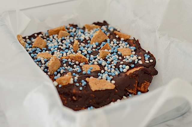 Laat de kraamfudge ongeveer 3 uurtjes opstijven in de koelkast.