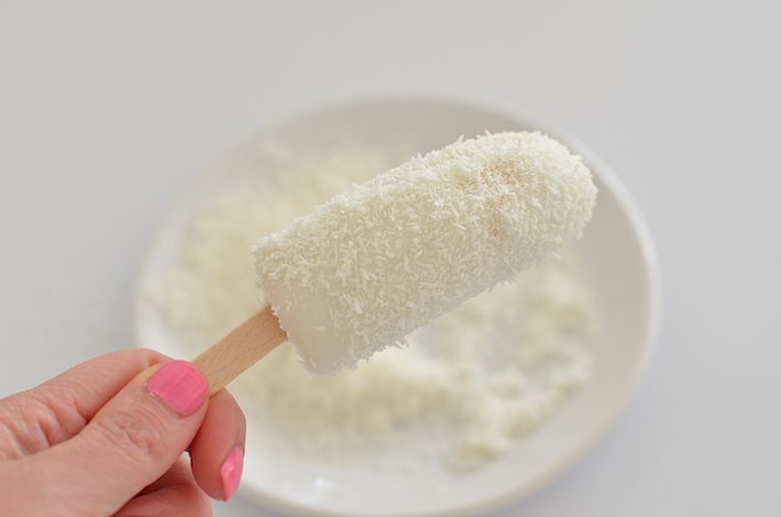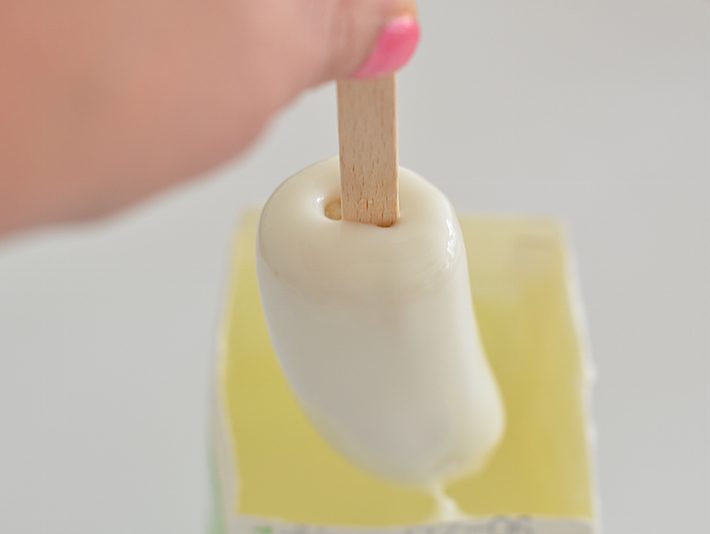 Neem een halve liter yoghurt, zo rechtstreeks uit het pak gaat het makkelijkste. Knip hem helemaal open en dip de bevroren banaan in de yoghurt. Laat de banaan even uitlekken,