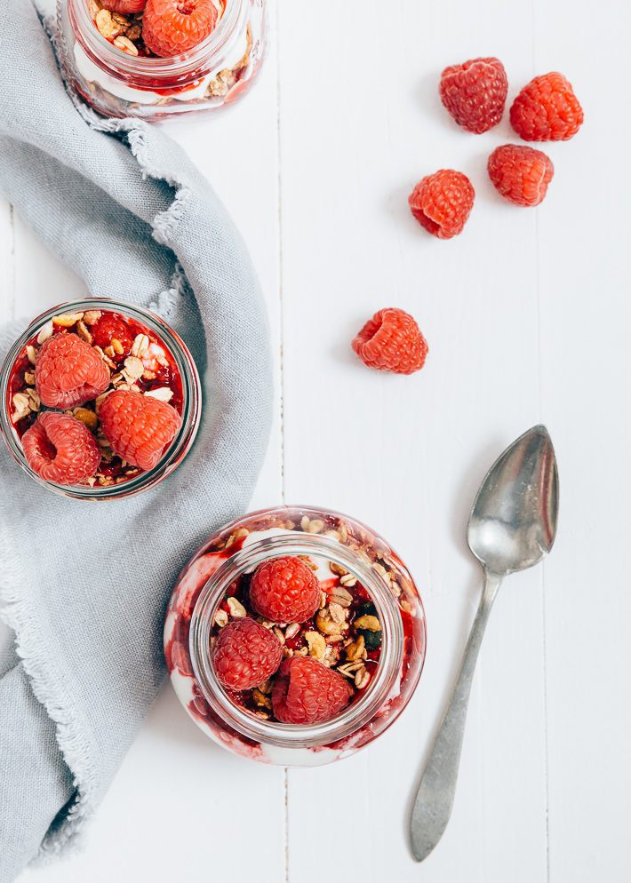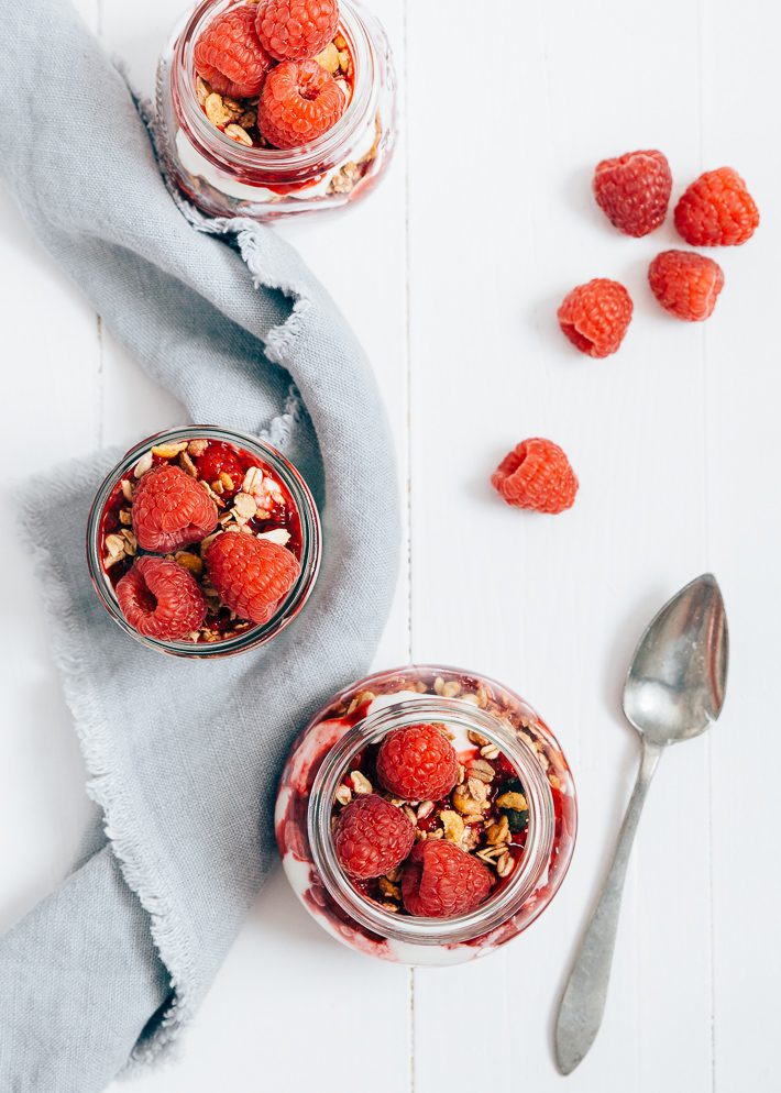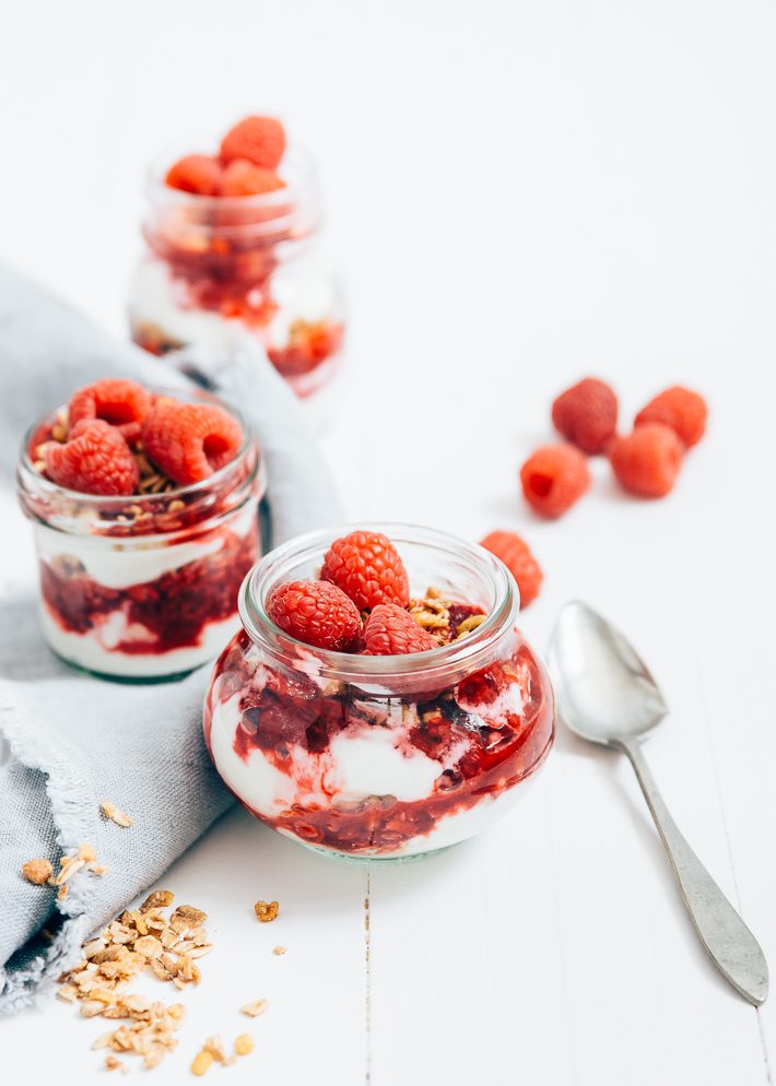 Ik kan me niet voorstellen dat ik ooit het ontbijt over zou slaan. Zodra ik wakker wordt begint mijn maag te rammelen en ren (ok strompel, geen ochtendmens) ik naar beneden om een ontbijtje te maken. Ik heb het liefst yoghurt, fruit en ontbijtgranen in de ochtend. Lekker fris en toch vullend en voedzaam. Deze kokosyoghurt parfait is een fijne variatie op mijn dagelijkse Griekse yoghurt. Vind je het niet een plaatje om te zien? Romige kokosyoghurt, met frisse frambozencompote en krokante granen. Yum! Ook leuk om je ontbijt zo te presenteren als je logees hebt, dan krijgen ze echt dat hotelgevoel.