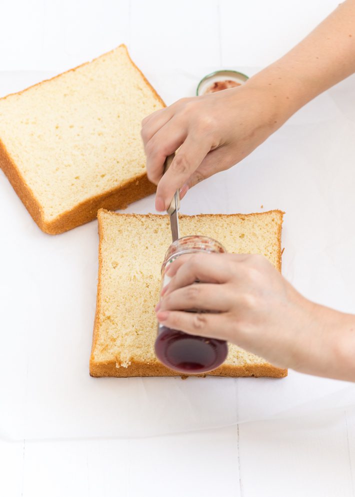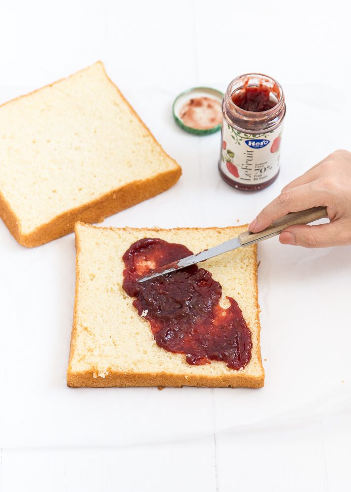 Halveer de cake en smeer de onderste helft rijkelijk in met de aardbeienspread. Leg de andere helft er bovenop. Snijd de spongecake in 9 gelijke vierkantjes.