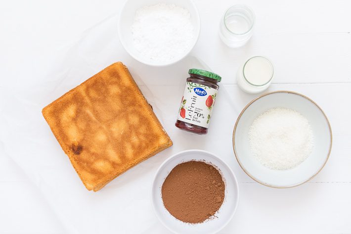 Soms zijn lamingtons gevuld met een laagje jam en soms ook niet. Met jam heeft uiteraard mijn voorkeur. In dit recept heb ik een laagje aardbeienspread van Hero Le Fruit gebruikt. Spread dus en geen jam, want het bevat minder suiker dan gewone jam en daarom mag het de naam niet hebben. Er zit 70% fruit in en dat proef je. Superlekker en fris in combinatie met de luchtige spongecake en zoete chocolade icing. Maurits kon al niet wachten tot ik ze gemaakt had want die is na Australië ook verslaafd geraakt aan deze cakejes. Dit zijn de klassiekers met chocolade en kokos, maar je hebt ook roze Lamingtons met frambozen of gele met citroen. Die bewaar ik voor een volgende keer. Beloofd.