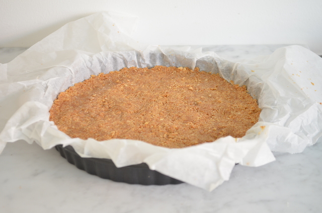 Bekleed de vorm met een velletje bakpapier. Strooi de koekkruimels erin en voeg de gesmolten boter toe. Meng het door elkaar met een lepel.