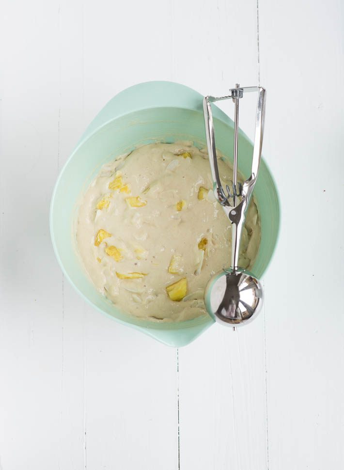 Dep de ananas droog met een keukenpapiertje. Snijd ze in kleine stukjes en dep ze nogmaals droog. Spatel de ananasstukjes en de kokosfakes door het beslag.