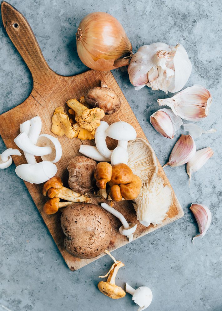 3. Maak de paddenstoelen schoon en bak ze in dezelfde pan rondom bruin. Voeg de spinazie toe en bak dit mee totdat het geslonken is. Voeg de oregano toe en wat peper en zout.