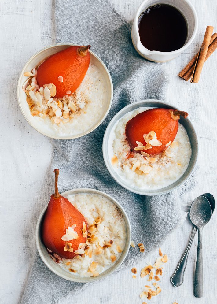 Verdeel de rijstpudding over 4 schaaltjes. Verdeel een halve stoofpeer over ieder bakje.