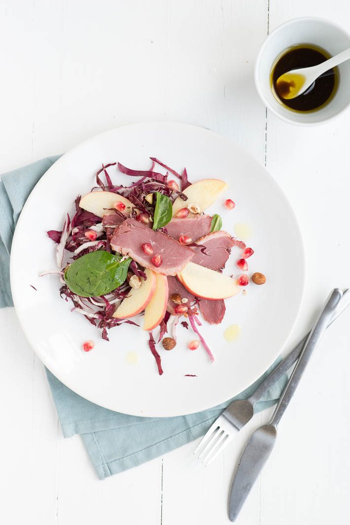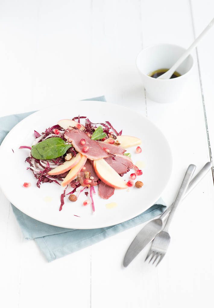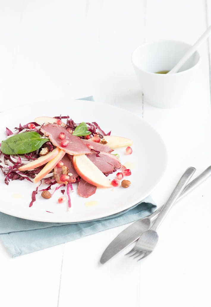 Vandaag heb ik een supermakkelijk en snel kerst voorgerecht voor jullie. Deze salade met gerookte eendenborst en granaatappel is zo gefixed. En stiekem houden we daar allemaal van, toch? Maar zoals je van mij gewend bent is het geen standaard gerecht. Sowieso is gerookte eendenborst al niet iets wat je iedere dag eet. Maar de radicchio (soort rode witlof) en granaatappel maken het helemaal feestelijk. Kan je prima mee aankomen bij het kerstdiner.