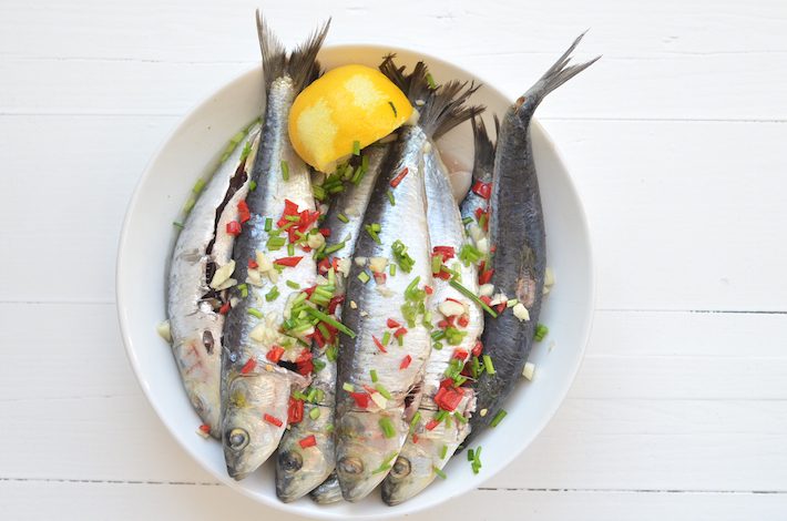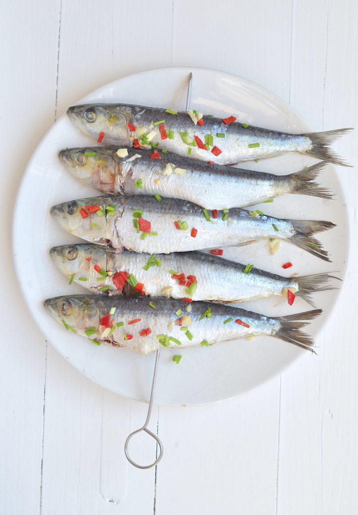 Ik wilde dat zelf ook doen, alleen het mooie weer bleef een beetje uit. Ik, ongeduldig als ik ben, stak de eerste zonnige dag van het jaar mijn mini tafel barbecue aan. Perfect voor het roosteren van wat sardientjes. Maar omdat het toch eigenlijk best wel koud was, stond ik in winterjas mijn visjes te grillen. Desalniettemin was het op en top zomer op mijn bord en smaakte het prima. Ik had de sardientjes per ongeluk in zijn geheel gekocht, dus ik moest ze zelf schoonmaken. Vond ik stiekem best een leuk klusje en het ging ook goed. Eerst netjes ontschubben en daarna de ingewanden verwijderen. Even goed afspoelen en lekker marineren.