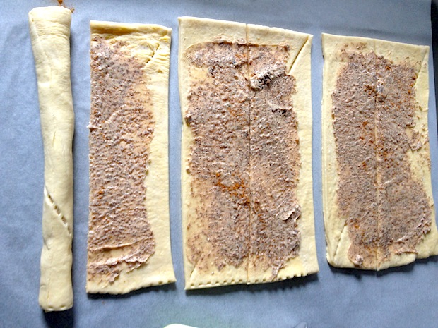 Haal het croissantdeeg uit het blikje en verdeel het in 3 rechthoeken.