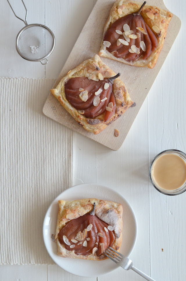 Garneer de stoofpeertaartjes met een handje amandelschaafsel.