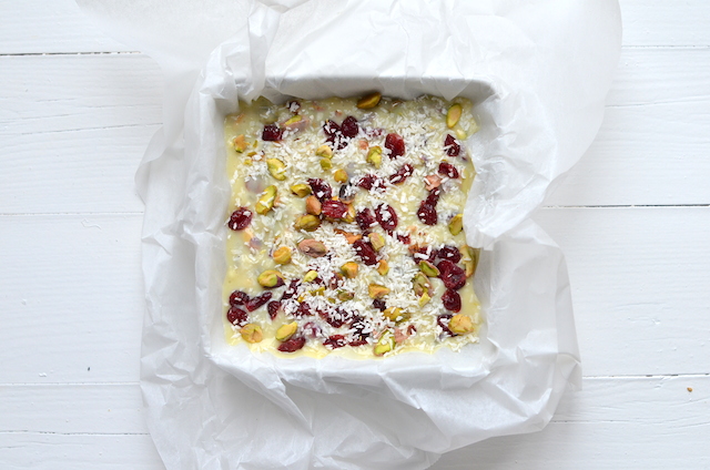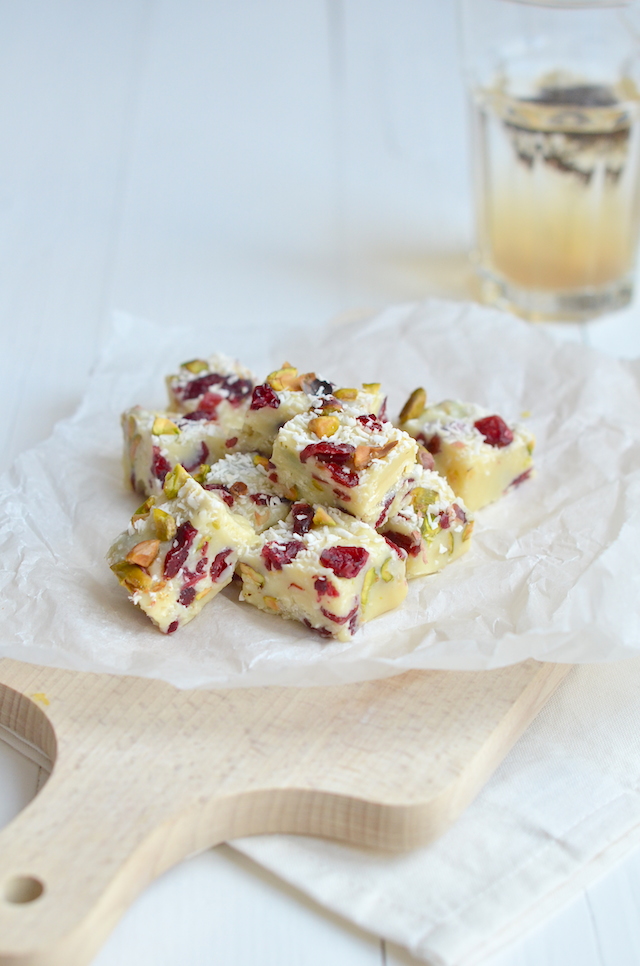 Laat de witte chocolade fudge ongeveer 3 uurtjes opstijven in de koelkast.