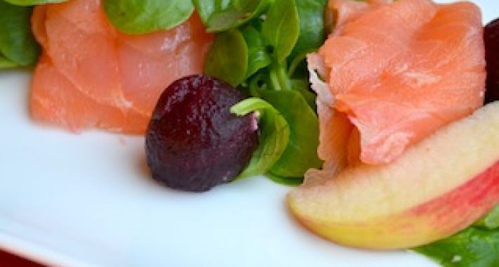 Verdeel de veldsla over het bord en leg daarop drie plakjes gerookte zalm.