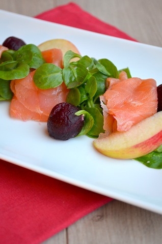 Ik at dit voorgerecht met zalm eens in Haarlem in een restaurant. En het was verbazingwekkend lekker, die typische rooksmaak van de zalm gaat heel goed samen met de aardse smaken van de biet en de appel is er lekker fris bij.